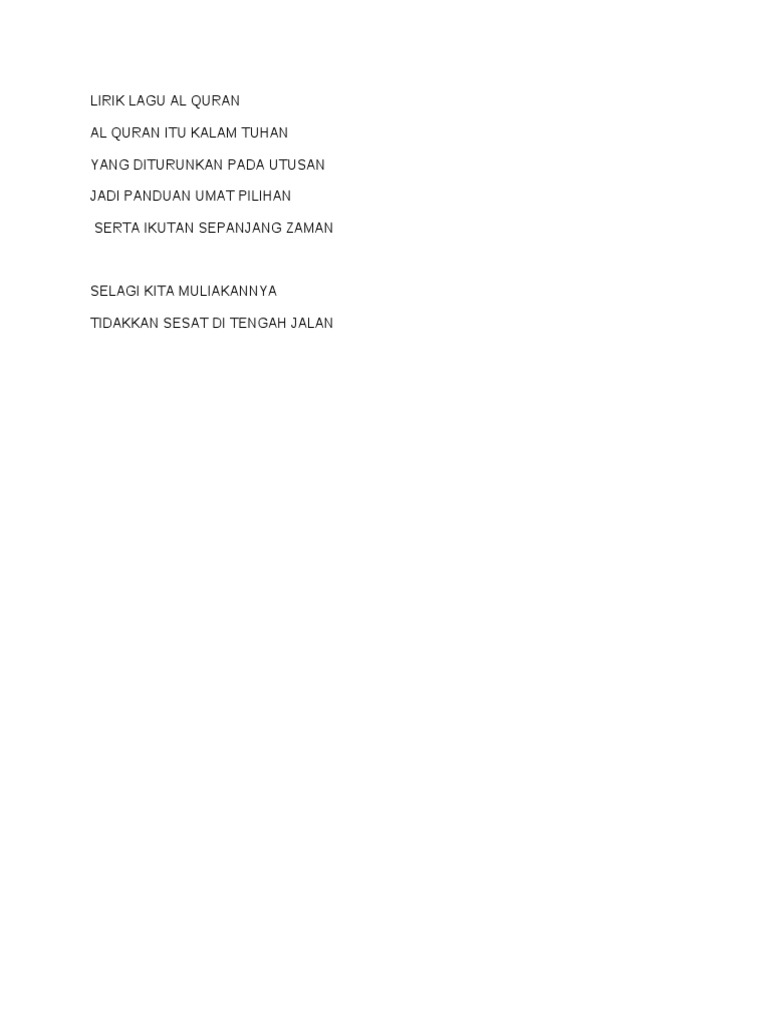 Lirik Lagu Malaysia. Kalam Tuhan Al quran huwayyahdi bil huda Lil mutaqinna fiihi sirojuwwa nurum mubin Fihi syyinamu. Tunjukilah kami jalan yang lurus.